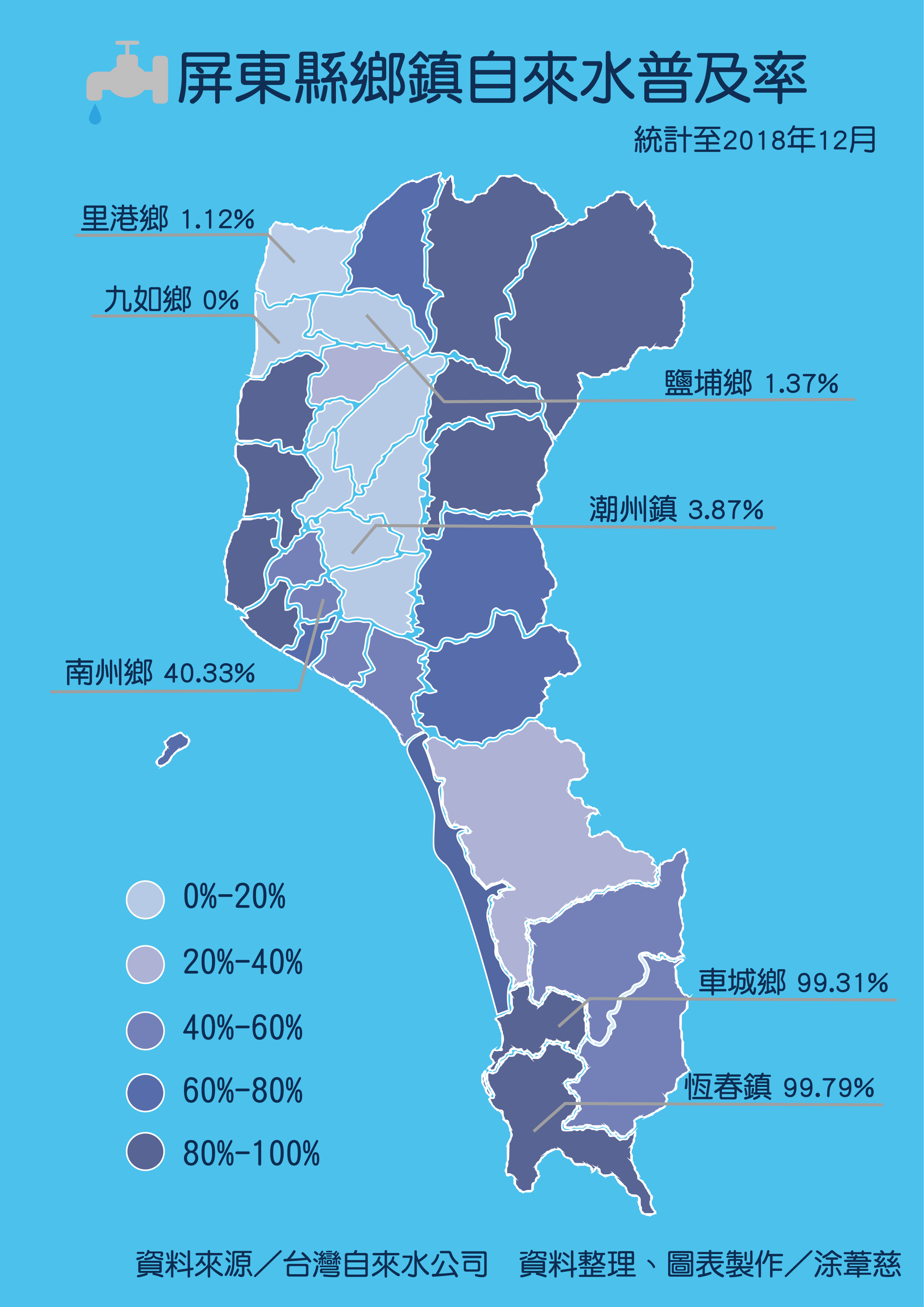 此外,屏東縣也是全台各鄉鎮自來水普及率差距最大的縣市。縣內33個鄉鎮市中,恆春、東港、新園及車城的普及率超過90%,潮州、里港、鹽埔等八個鄉鎮普及程度卻未達5%。其中,位於屏東北部的九如鄉,自來水普及率甚至為0%,完全沒有任何家戶裝設自來水。
