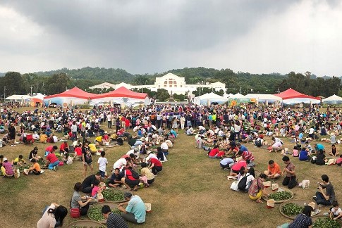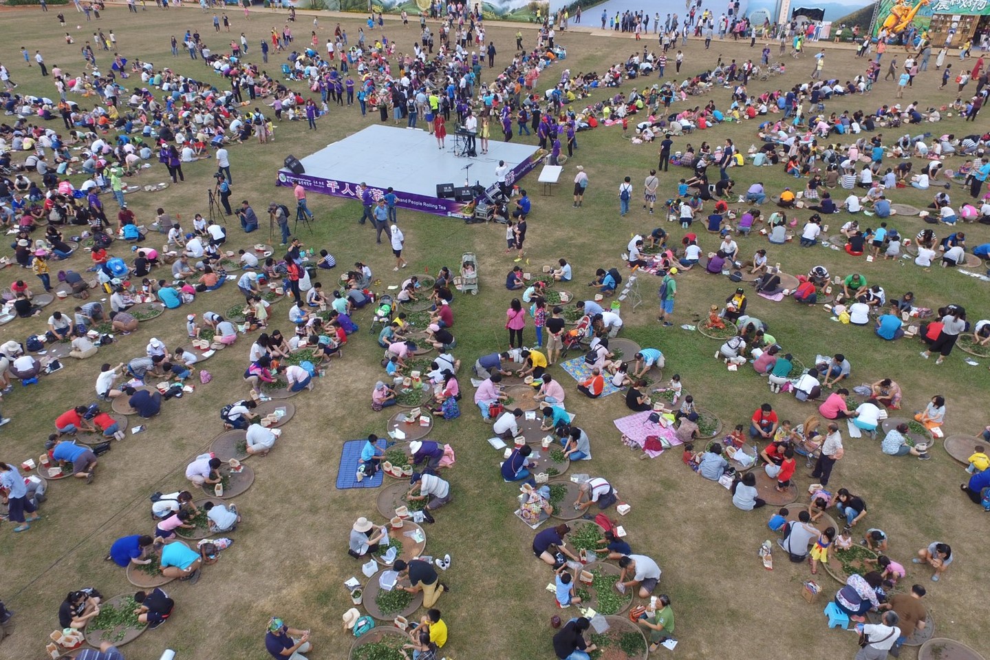 「千人揉茶」活動的空拍畫面,民眾依照主辦單位規劃的分區體驗揉茶。 圖/水里鄉農會推廣部主任黃琇提供