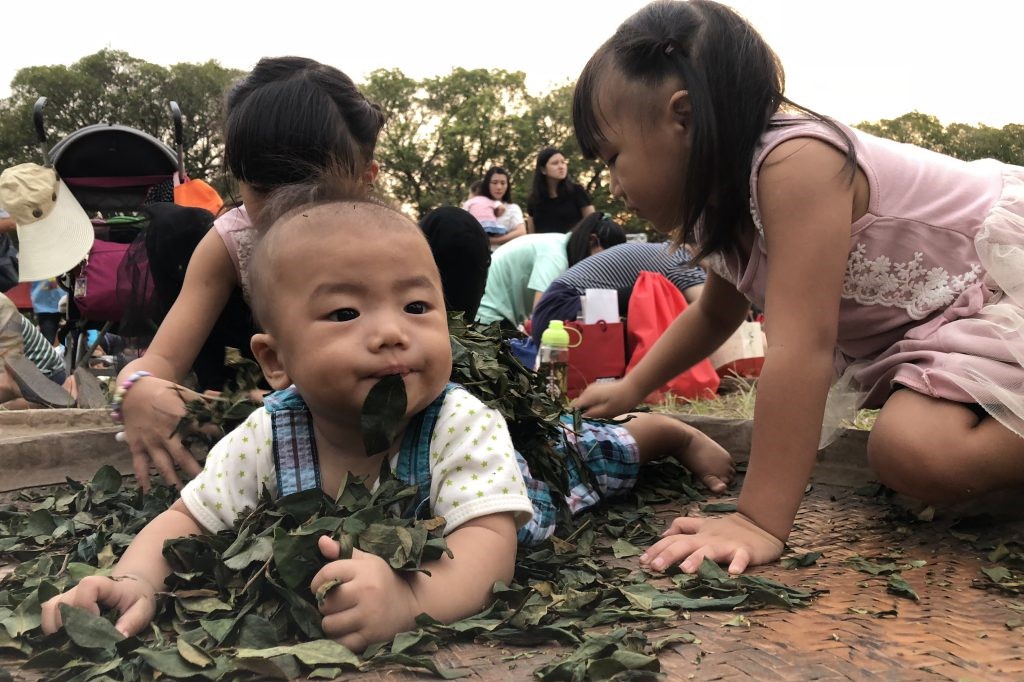 「千人揉茶」活動的參加民眾分布年齡非常廣,現場的小孩們在竹簍裡把玩新鮮的茶葉。 圖/黃郁期攝
