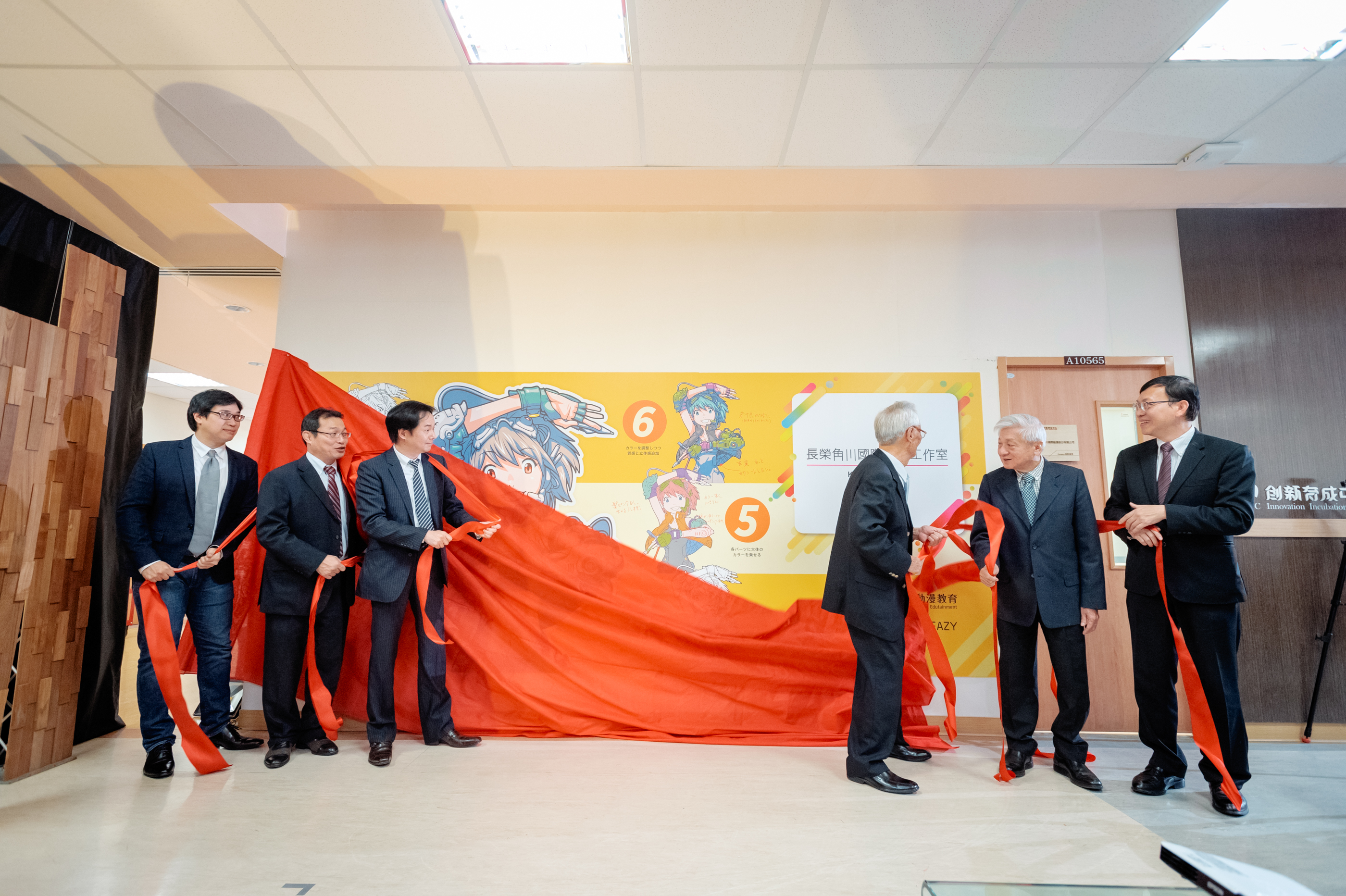 所有人接下布條,期盼台灣角川國際動漫教育與長榮大學合作的工作室能發揚台灣動漫產業。 圖/長榮大學公關中心郭育涵提供