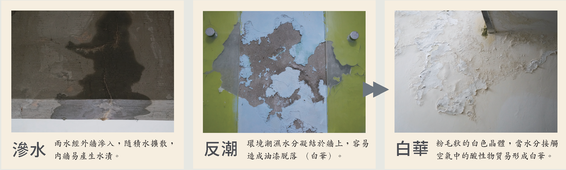 游仁君指出,未做好防潮防水措施的情況下,若雨水經由天台和外牆滲入牆面,容易導致屋內牆壁發生反潮(造成油漆剝落),且當滲入的水份過多,可能將碳酸鈣帶出牆面,乾燥後便會形成白色結晶,附著於牆面、頂板,即為「白華」,經手一觸碰,可見明顯的白色粉末脫落。