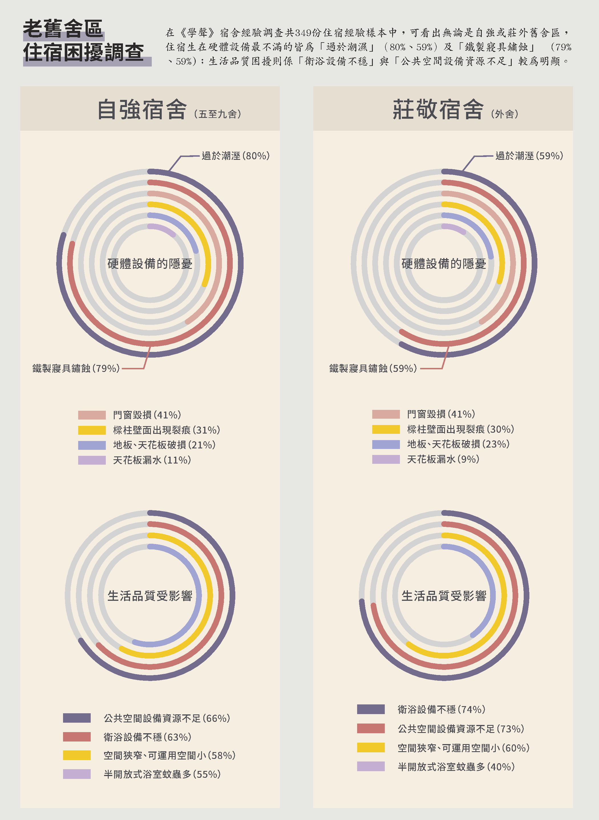 你是否也曾對宿舍鐵製寢具鏽蝕,或是潮溼導致的壁癌而感到困擾?山上及莊外宿舍老舊,諸多住宿生在《學聲宿舍經驗調查》問卷中抱怨連連,占地狹小的自強和莊外宿舍,加上空間擁擠,物理環境與心理條件都讓學生們感到不舒適。雖然過去興建宿舍時,建築法規僅要求結構穩定,但現今學生的生活品質和需求也應積極考量。