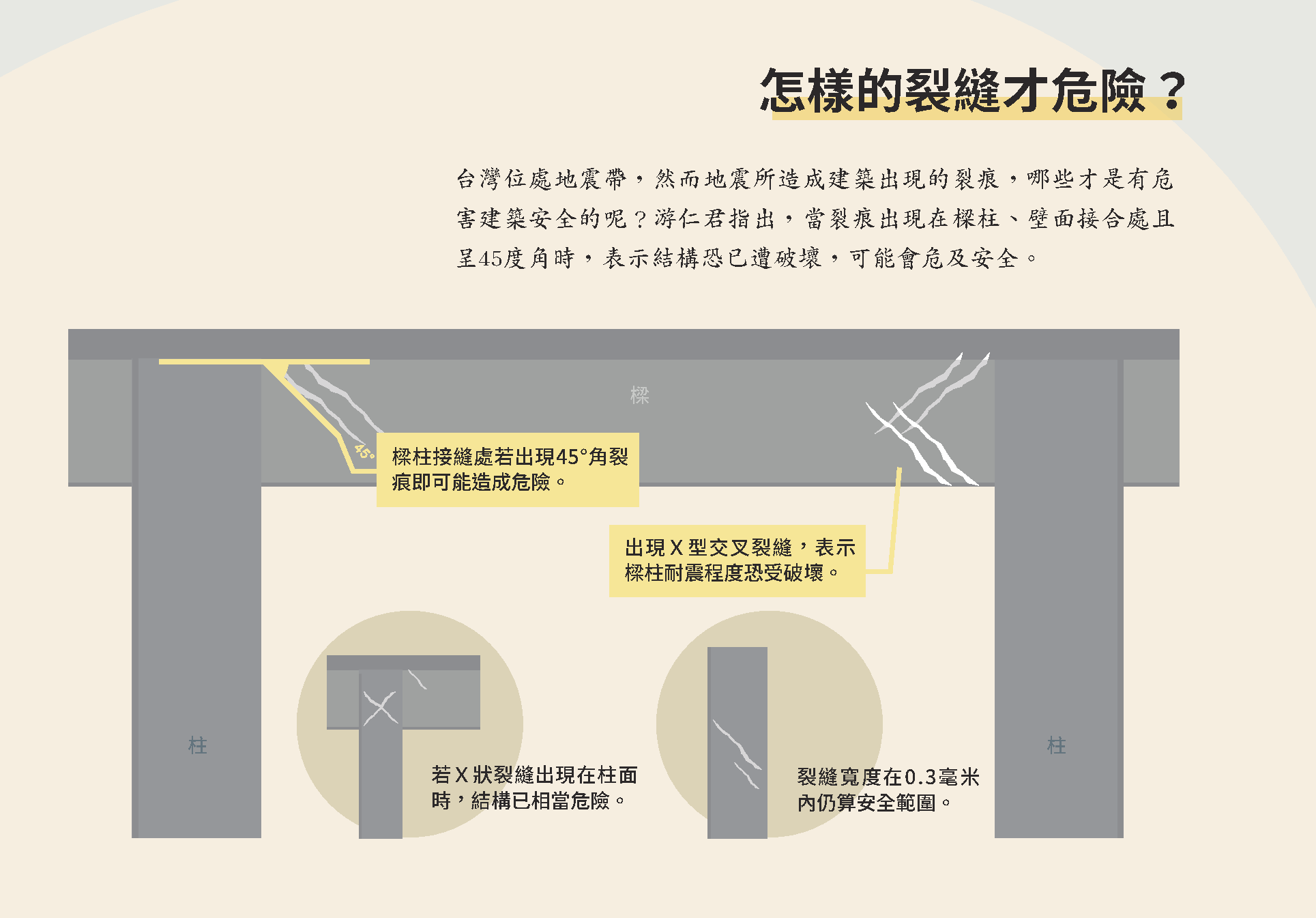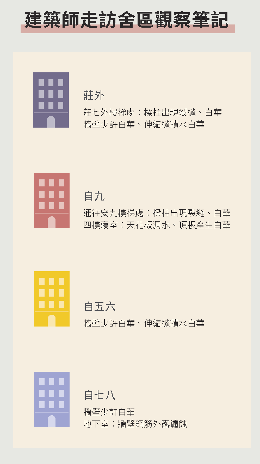 本次專題特別邀請,於勤益科大景觀系擔任講師的建築師游仁君,走訪部分校內宿舍,針對自強五到九舍以及莊外宿舍,進行初步的建物安全審查。游仁君表示,除了幾個重點區域外,宿舍寢室內外和公共空間,雖然出現不少反潮、白華現象,但大致不影響結構安全。