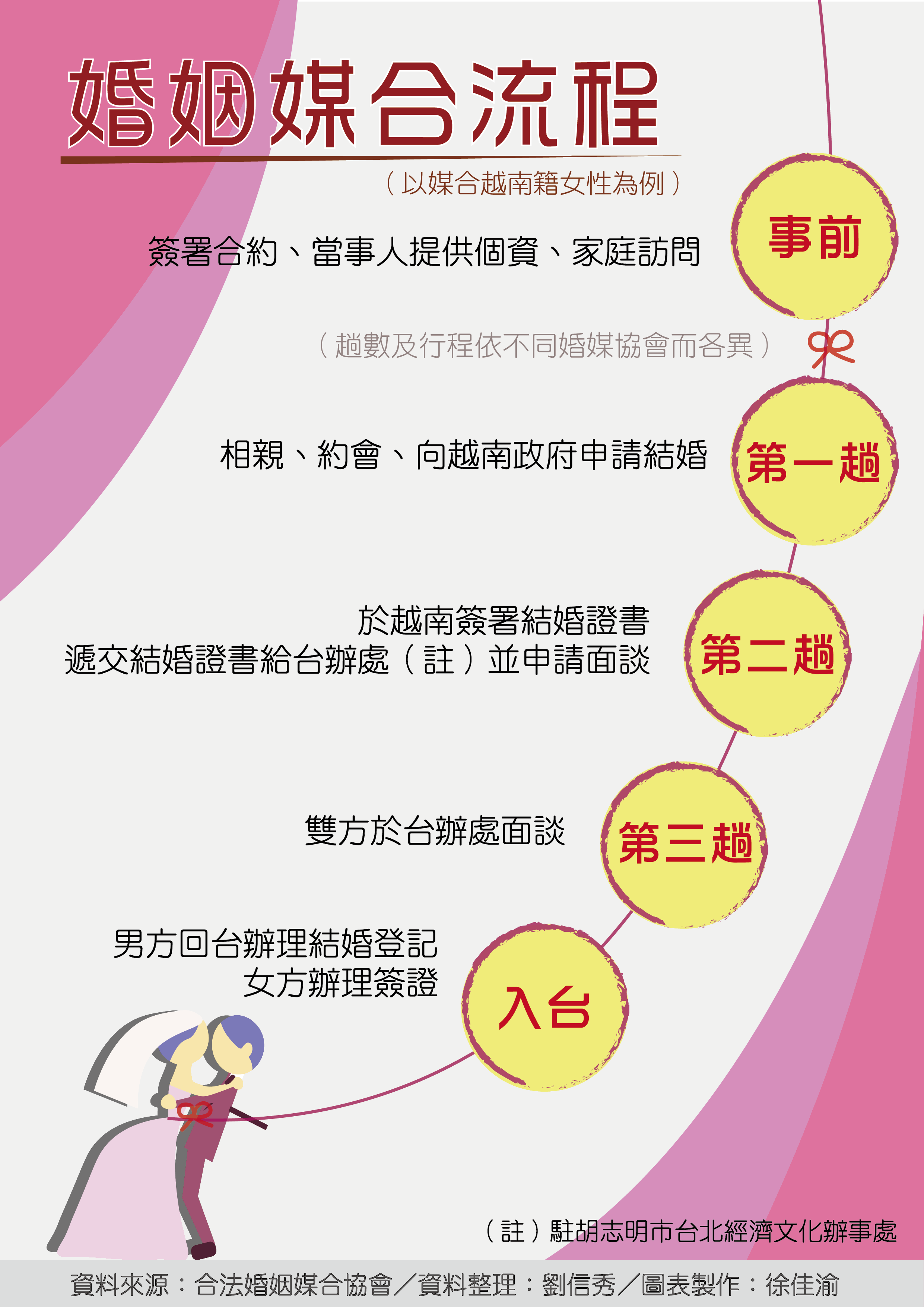 台灣合法跨國婚媒協會主要媒合台灣男性與外籍女性,其中,外籍女性以來自越南、中國居多,她們透過家鄉的「媒人」引薦,將其個人資料送往台灣婚媒協會,獲得參加相親的機會。而欲媒合的台灣男性則會直接與協會聯繫,諮詢相關流程及收費細節,在雙方達成共識後展開一連串媒合程序。