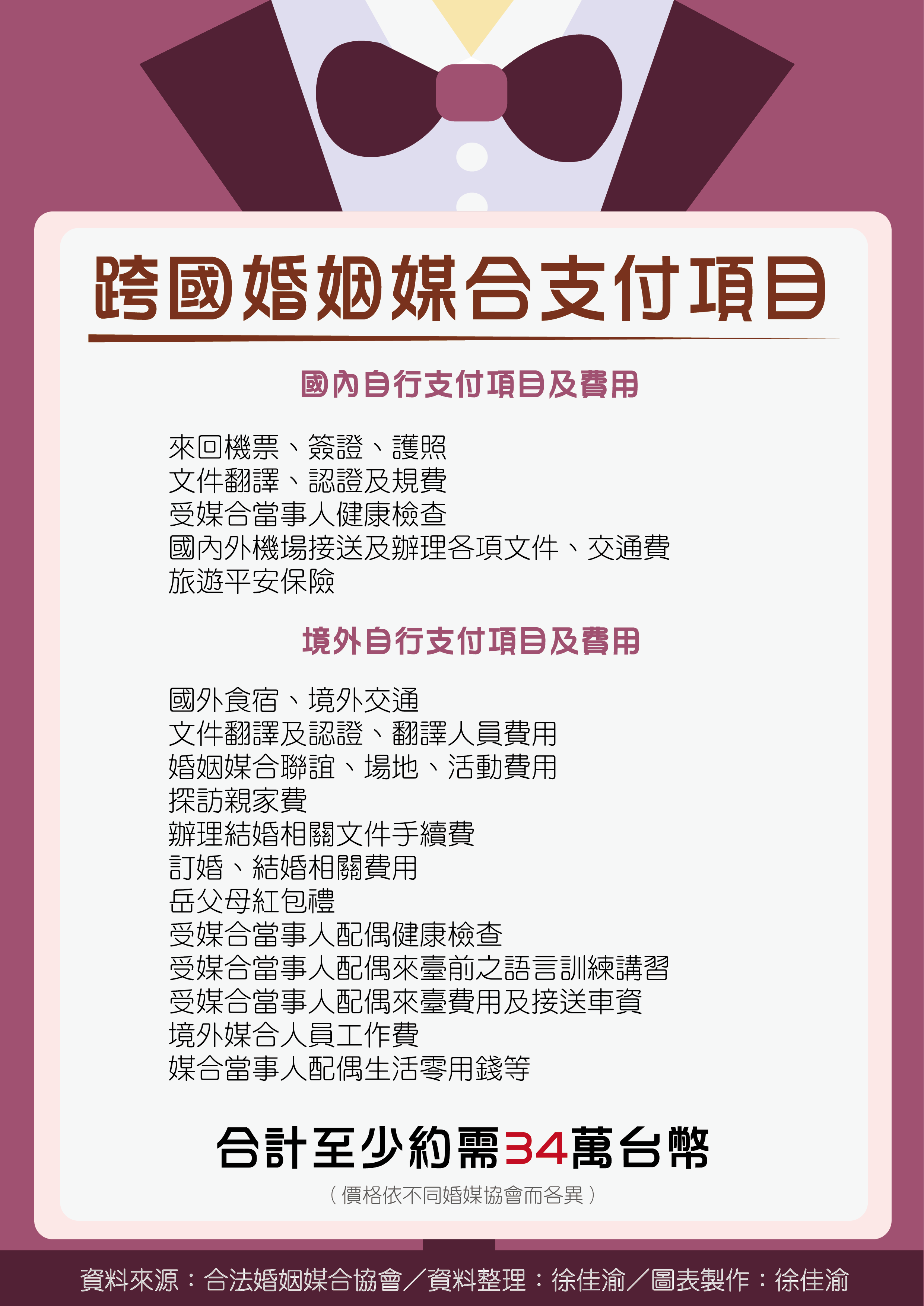 全台34家合法的跨國婚姻媒合協會,皆為核准成立的非營利社團法人。協會須備妥「收費項目一覽表」、「工作人員名冊」等多項文件,向移民署申請從事跨國境婚姻媒合許可,並經書面審查、獲發許可證,才能成為移民署正式公告的「許可從事跨國境婚姻媒合團體」。